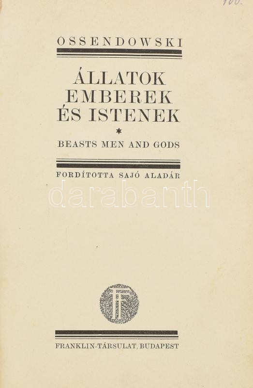 [Ossendowski, Ferdynand Antoni (1876-1945)] Ossendowski: Állatok, emberek és istenek. (Beasts, Men and Gods). Ford.: Sajó Aladár. Bp., [1925], Franklin-Társulat, 1 (térkép) t.+ 240 p. Átkötött félvászon-kötésben, helyenként kissé foltos lapokkal.