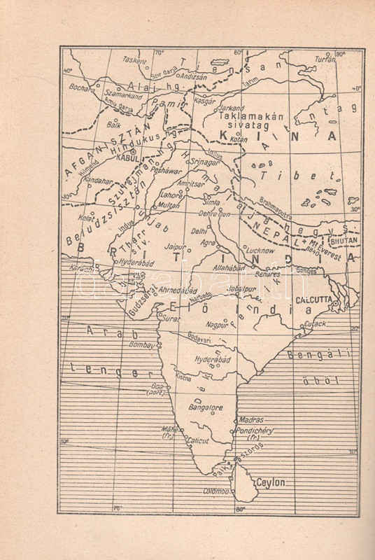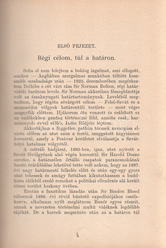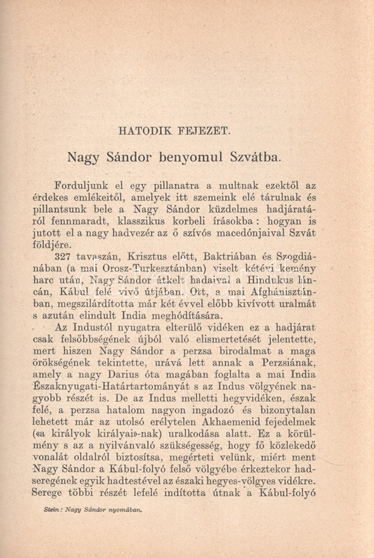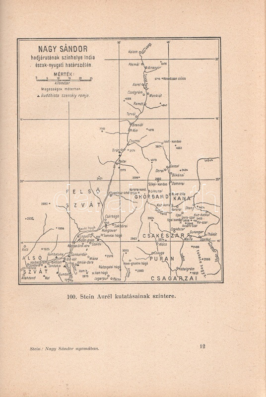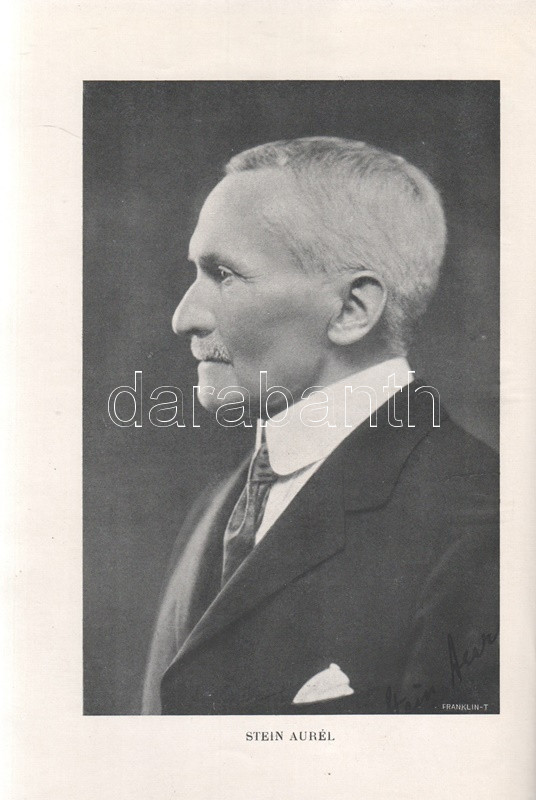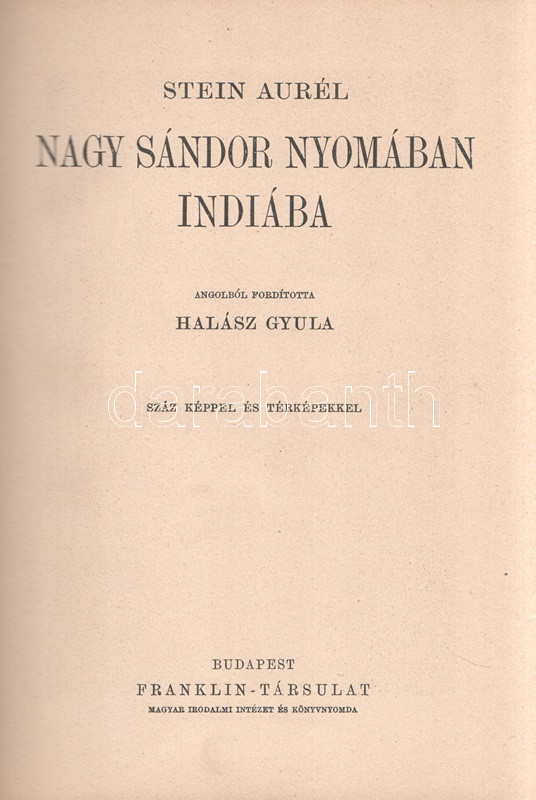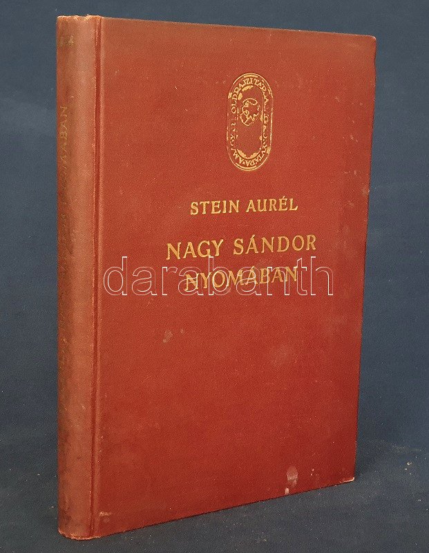 Stein Aurél: Nagy Sándor nyomában Indiába. Angolból fordította Halász Gyula. Száz képpel és térképpel. Budapest, [1931]. Franklin-Társulat Magyar Irodalmi Intézet és Könyvnyomda. 1 t. (címkép) + 183 + [1] p. + 32 t. (kétoldalas) Stein Aurél (1862-1943) magyar származású brit Kelet-kutató kisebb megszakításokkal 1886-tól dolgozott az indiai brit adminisztrációnak, több helyi egyetemen is oktatott, 1900-1931 között négy nagy hatású expedícióban térképezte fel Belső-Ázsia fehér foltjait. Néprajzi kitérőkben gazdag útírása egy kisebb, 1926-ban megtett kutatóútjának beszámolója, melynek során India északnyugati, sivatagos és hegyvidékekkel szaggatott tájait járta be, az egykori hódító, Nagy Sándor hadvezér útja által inspiráltan. A munka eredeti nyelven először 1929-ben jelent meg, ,,On Alexander's Track to the Indus" címmel. Aranyozott kiadói egészvászon kötésben. Ovális emblémájú kötésváltozat. Jó példány.