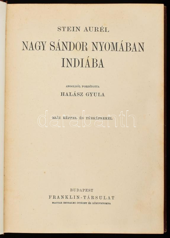 Leírás: Stein Aurél (1862-1943): Nagy Sándor nyomában Indiába. Ford.: Halász Gyula. Magyar Földrajzi Társaság Könyvtára. Bp., [1931], Franklin, 1 t. (címkép)+183 p.+32 (kétoldalas fekete-fehér képtáblák). Két egészoldalas térképpel. Kiadói dúsan aranyozott egészvászon sorozatkötésben, kopott borítóval, foltos lapok.