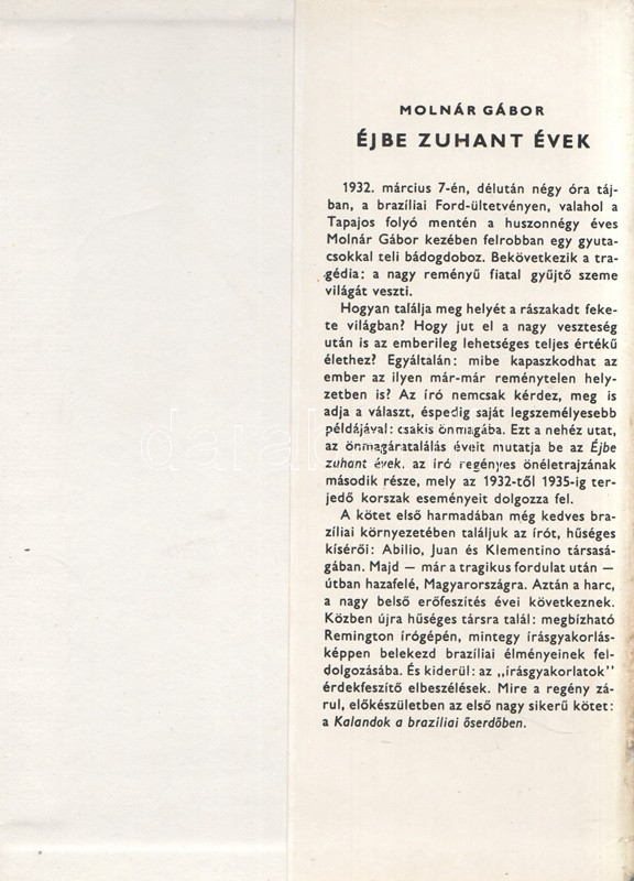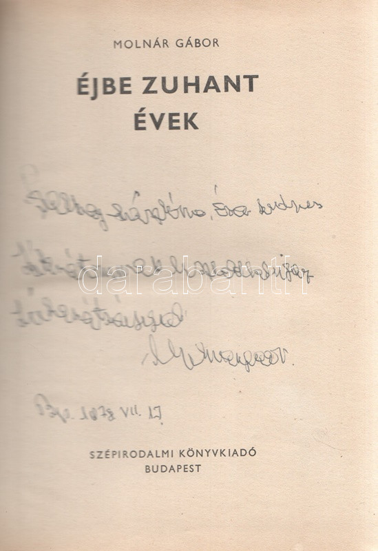 Molnár Gábor: Éjbe zuhant évek. (Dedikált.) Budapest, (1973). Szépirodalmi Könyvkiadó (Franklin Nyomda). 375 + [3] p. Első kiadás. Dedikált: ,,Szallay Lászlóné Éva kedves jó barátomnak [...] Molnár Gábor. Bp. 1978. VII. 13." Molnár Gábor (1908-1980), a 20. század egyik legnépszerűbb magyar vadász- és útírója első, 1930-1932 között megtett brazíliai útján a Nemzeti Múzeum számára végzett gyűjtőmunkát. A munka rendszerezése közben, 1932 márciusában a kutatót személyes tragédia érte, egy baleset következtében megvakult. Az írógép segítségével magára szerzői önmagára találó Molnár Gábor írói pályafutása ezt követően teljesedett ki, műveit már vakon írta, aláírásai és dedikációi is így születtek. Munkáit több nyelvre is lefordították. Önéletírása a balesete utáni első néhány, még Brazíliában töltött évéről, majd hazatéréséről számol be, élete sorsfordító, 1932-1935 közötti időszakáról. Példányunk első repülő előzéke hiányzik. Aranyozott kiadói egészvászon kötésben, színes, illusztrált, enyhén sérült, enyhén hiányos kiadói védőborítóban.
