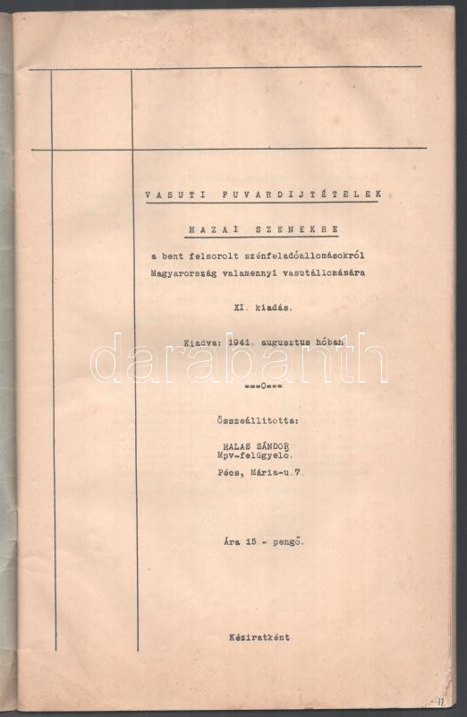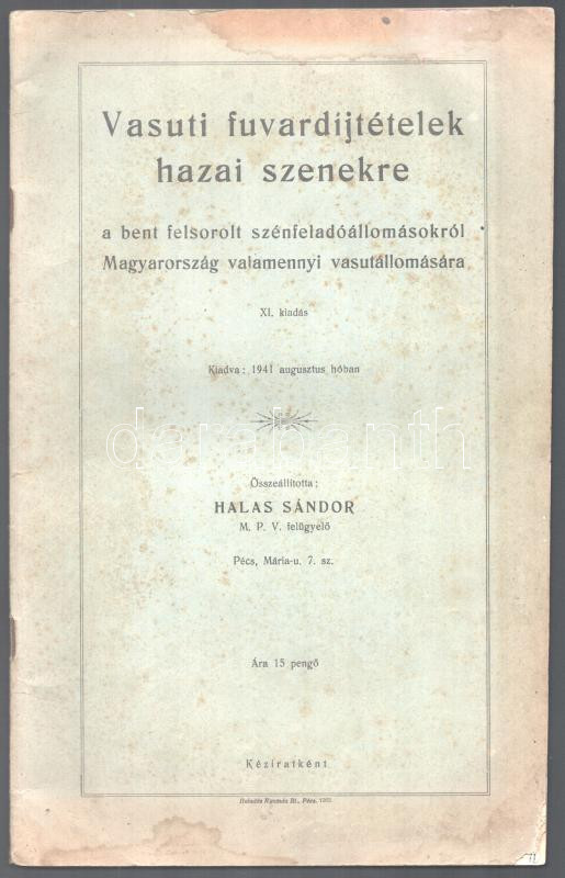 Halas Sándor (szerk.): Vasuti fuvardijtételek hazai szenekre, a bent felsorolt szénfeladóállomásokról Magyarország valamennyi vasutállomására. Kéziratként. Pécs, 1941, k.n. XI. kiadás. 61 p. Kiadói papírkötés, foltos és kissé sérült borítóval, első néhány lap alsó sarkában kissé sérült,
