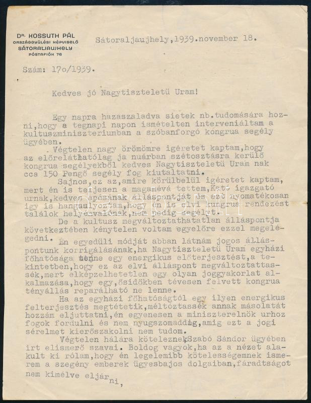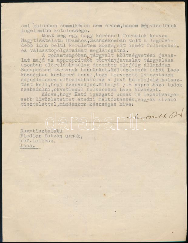 Leírás: Kossuth Pál (1887-1966) földbirtokos, főszolgabíró, országgyűlési képviselő aláírt levele lácai lelkésznek