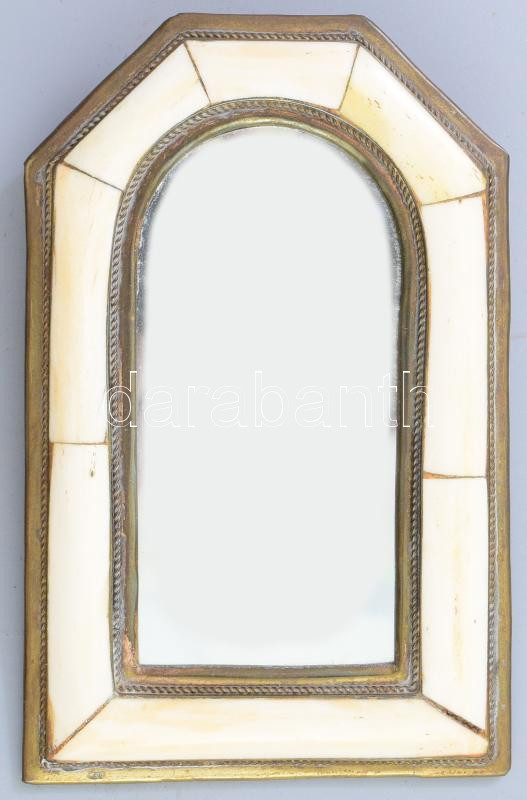 Leírás: Akasztható kis réz tükör, csont berakásokkal, 14x9 cm