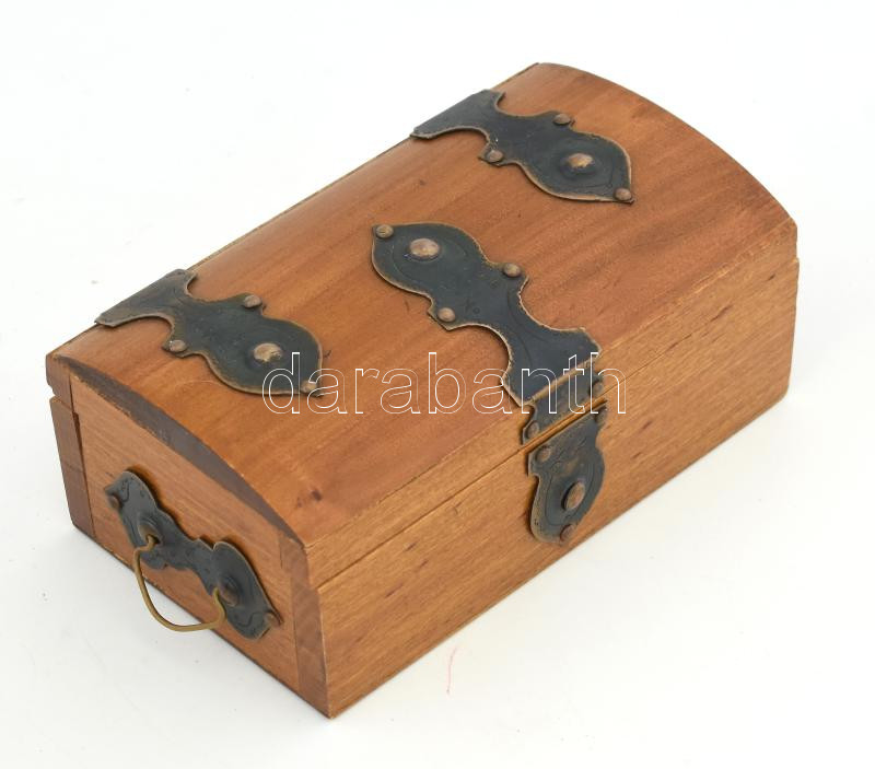 Leírás: Fémveretes díszdoboz, a Nemez- és Rostfeldolgozó Háziipari Szöv. címkéjével, 16x9x7 cm