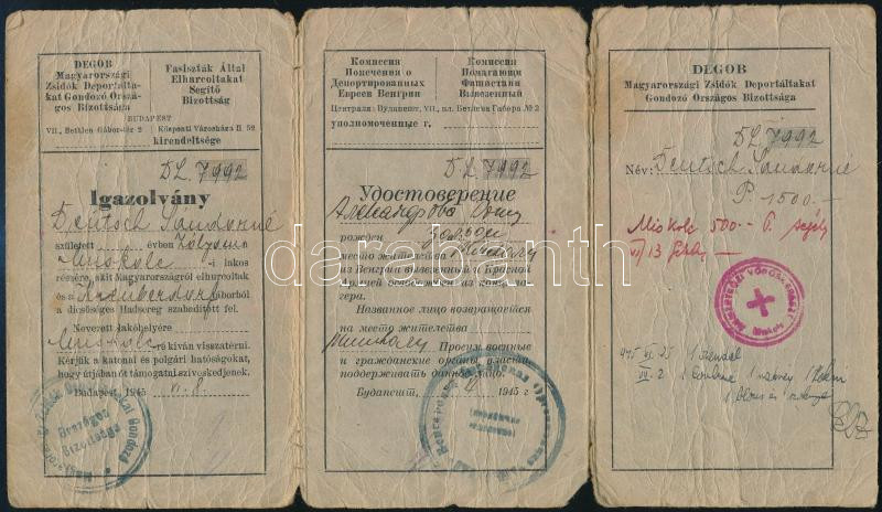 1945 Sopron, DEGOB - Magyarországi Zsidók Deportáltakat Gondozó Ország... https://www.darabanth.com/hu/473-Gyorsarveres/473.0/Mutargy-papirregiseg-egyeb/Judaika~1000004/1945-Sopron-DEGOB-Magyarorszagi-Zsidok-Deportaltakat-Gondozo-Orszagos-Bizottsaga-orosz-magy~II3213142