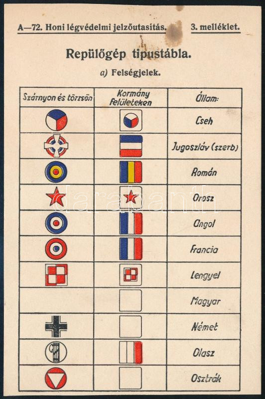 cca 1935 72. Honvédelmi jelzőutasítás melléklete repülőgépek és felség... https://www.darabanth.com/hu/473-Gyorsarveres/473.0/Mutargy-papirregiseg-egyeb/Militaria~1000009/cca-1935-72-Honvedelmi-jelzoutasitas-melleklete-repulogepek-es-felsegjelzesek-10x15-cm~II3213138