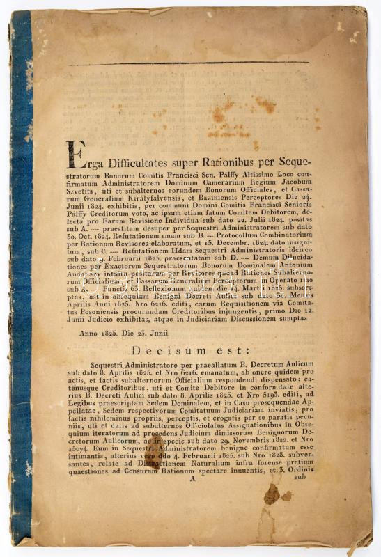 Leírás: 1825 Pálffy Ferenc peres ügyében született bírósági határozat, a teljes ügy leírásával. latin nyelven 46p.
