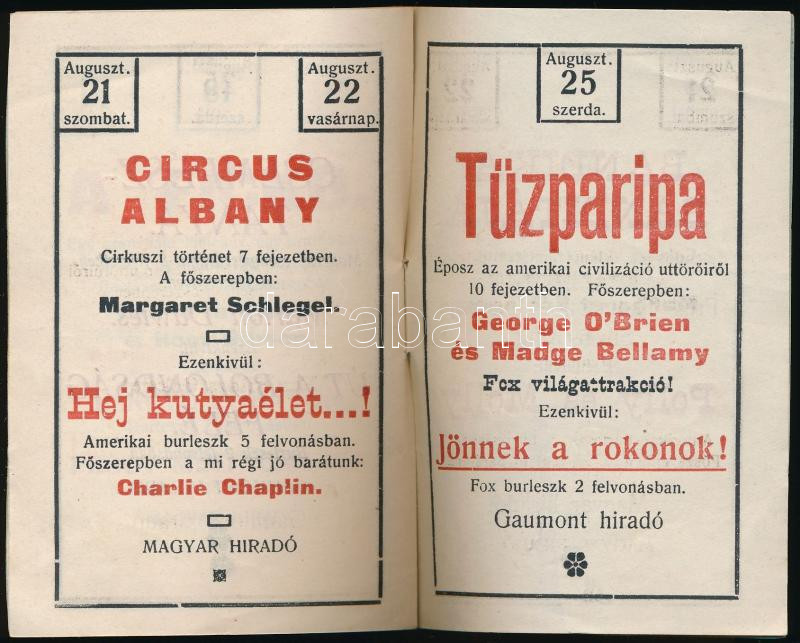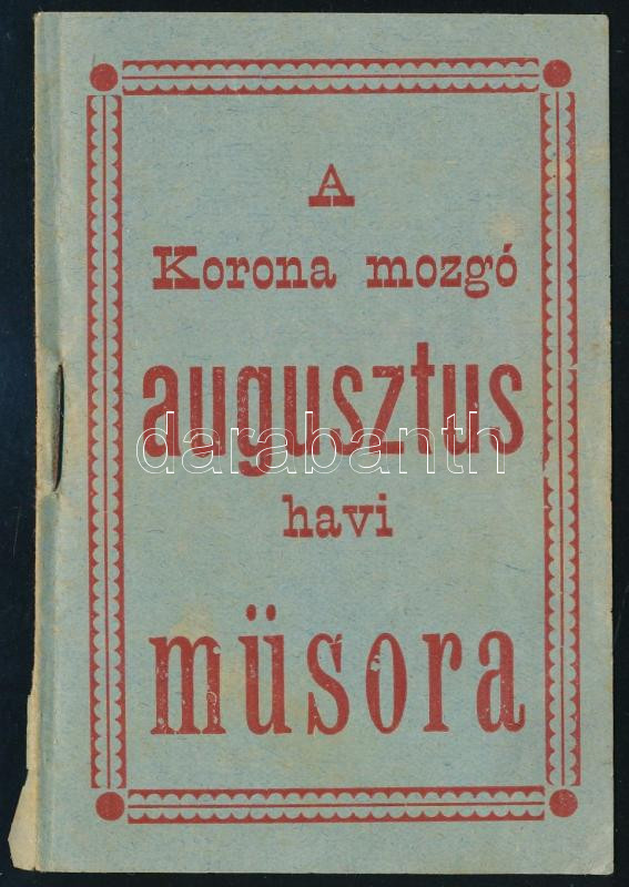 Leírás: 1926 Békés, a Korona Mozgó augusztus havi műsora, mozi műsorfüzet, tűzött papírkötés, a hátsó borítón hiánnyal