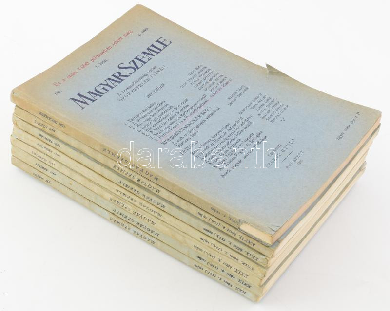 1927-1937 A Magyar Szemle 7 db száma: I. köt. 4. sz., XXVII. köt. 2. sz., XXIX. köt. 1., 2., 3., 4. sz., XXX. köt. 1. sz. Szerk.: Szekfű Gyula. Bp., 1927-1937, Magyar Szemle Társaság. Számos érdekes történelmi, társadalomtudományi, helytörténeti témájú írással (Eckhart Ferenc: Ferenc József és a Kossuth-kultusz; Csekey István: A Harmadik Birodalom alkotmánya; Zathureczky Gyula: Magyarok megfélemlítése Erdélyben; stb.) Kiadói papírkötés, vegyes állapotban.