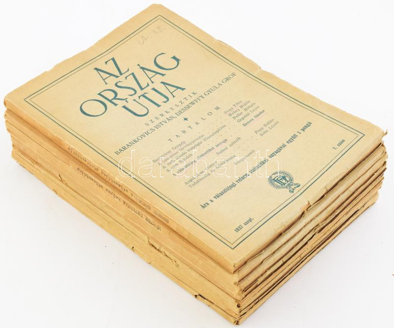 1937-1938 Az Ország Útja. Antifasiszta szellemiségű állam- és nemzetpolitikai folyóirat. I. évf. 7-10. sz., II. évf. 2., 4., 10., 12. sz. (össz. 8 db). Szerk.: Barankovics István, gróf Dessewffy Gyula. Kiadói papírkötés, vegyes állapotban.