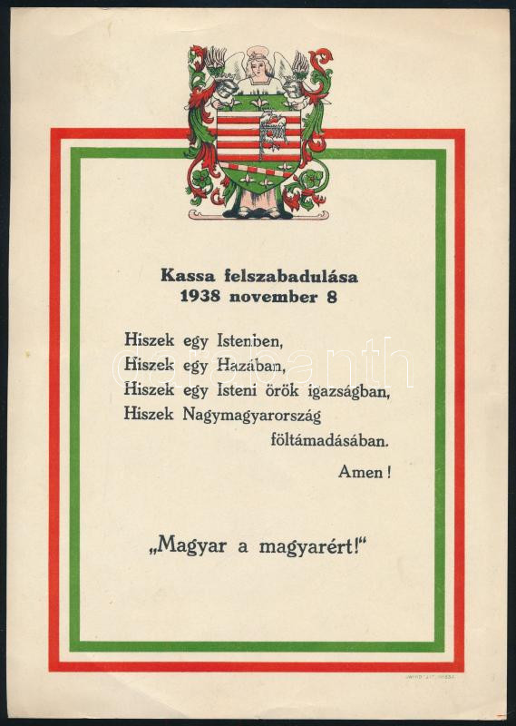 1938 Kassa felszabadulása, Irredenta Hiszekegy dekoratív emléklap 17x2... https://www.darabanth.com/hu/473-Gyorsarveres/473.0/Mutargy-papirregiseg-egyeb/Nyomtatvanyok~1000013/1938-Kassa-felszabadulasa-Irredenta-Hiszekegy-dekorativ-emleklap-17x24-cm~II3194541