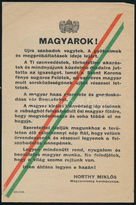 1938 "Magyarok! Újra szabadok vagytok!" A felvidéki bevonulá... https://www.darabanth.com/hu/473-Gyorsarveres/473.0/Mutargy-papirregiseg-egyeb/Nyomtatvanyok~1000013/1938-Magyarok-Ujra-szabadok-vagytok-A-felvideki-bevonulas-alkalmabol-nyomtatott-szorolap-~II3194531