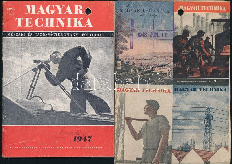 1947-1948 Magyar Technika, a Magyar Mérnökök és Technikusok Szabad Szakszervezete folyóiratának 2 db száma. Tűzött papírkötés (kisalakú, 14x10 cm), lyukasztással.