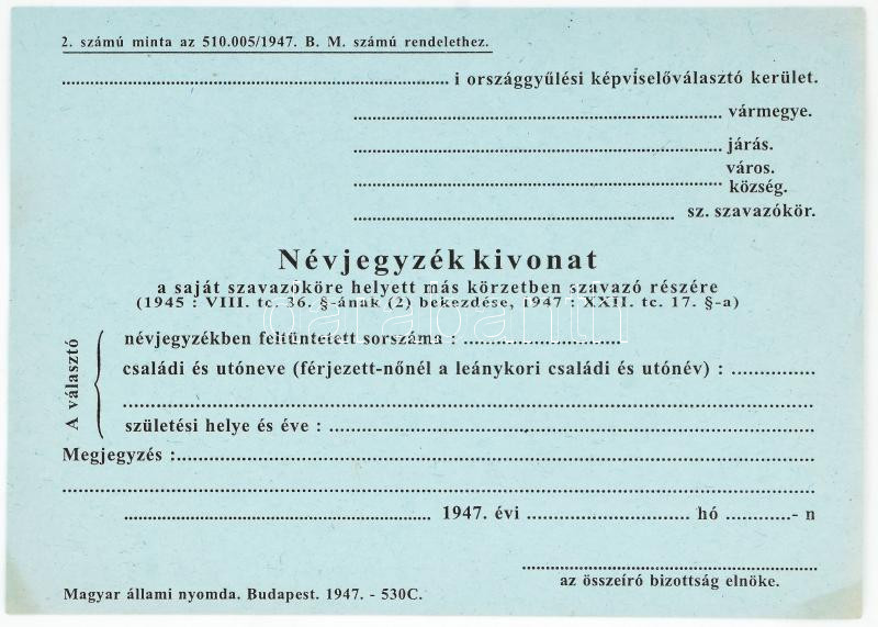 1947 A ,,kékcédulás választások" kitöltetlen cédulája (Névjegyzék... https://www.darabanth.com/hu/473-Gyorsarveres/473.0/Mutargy-papirregiseg-egyeb/Nyomtatvanyok~1000013/1947-A-kekcedulas-valasztasok-kitoltetlen-cedulaja-Nevjegyzekkivonat-Szavazasi-url~II3201586