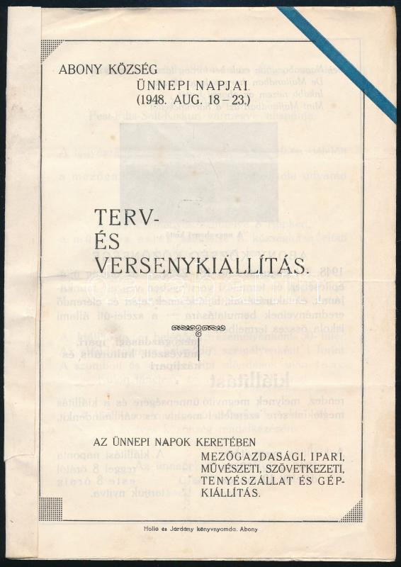 1948 Abony, terv- és versenykiállítás műsorfüzet 6p. https://www.darabanth.com/hu/473-Gyorsarveres/473.0/Mutargy-papirregiseg-egyeb/Nyomtatvanyok~1000013/1948-Abony-terv-es-versenykiallitas-musorfuzet-6p~II3213871