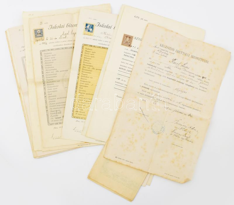 Leírás: cca 1919-1920 20 db pécsi iskolai bizonyítvány, érdekes szerb megszállás következtében megjelenő okmánybélyeg hiány miatti megjegyzésekkel