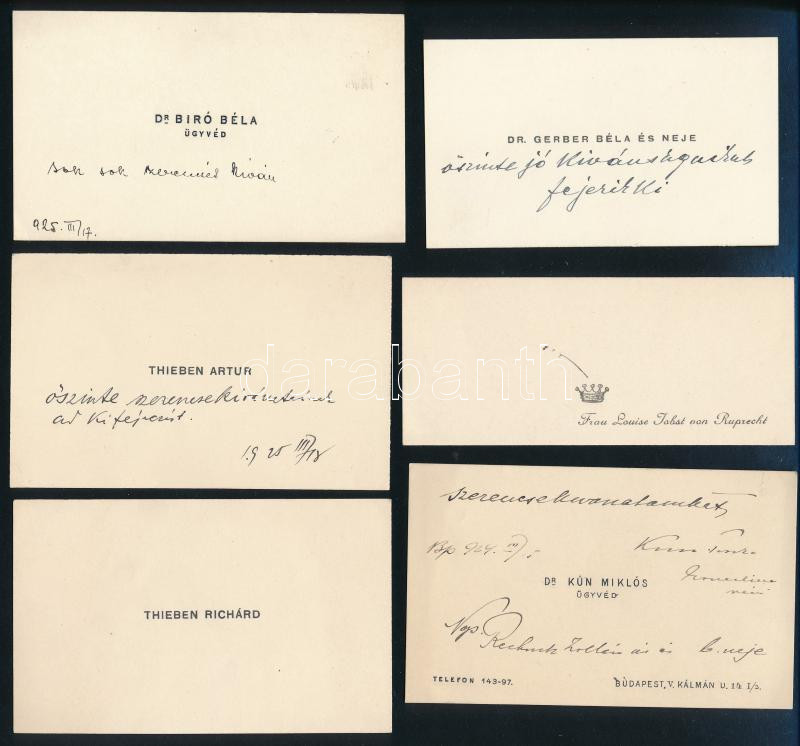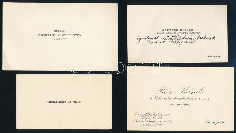 cca 1925 össz. 10 db névjegy, közte Ruprechti Jobst Frigyes/ Friedrich Jobst von Ruprecht (1877?-1940) m. kir. tábornok, hadmérnök saját kezű német nyelvű soraival és aláírásával; Rácz Kornél a Viktuália Kereskedelmi Rt. és Deutsch Miklós a Magyar Általános Hitelbank igazgatója, mindkettőm autográf feliratokkal stb.