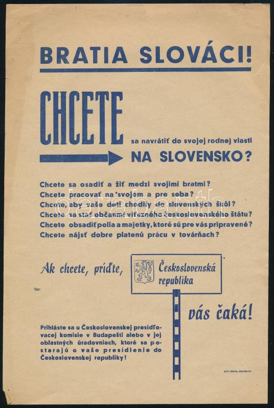 cca 1945 Csehszlovákiába áttelepedést reklámozó szórólap szlovákoknak ... https://www.darabanth.com/hu/473-Gyorsarveres/473.0/Mutargy-papirregiseg-egyeb/Nyomtatvanyok~1000013/cca-1945-Csehszlovakiaba-attelepedest-reklamozo-szorolap-szlovakoknak-17x24-cm-Flyer-for-~II3204163