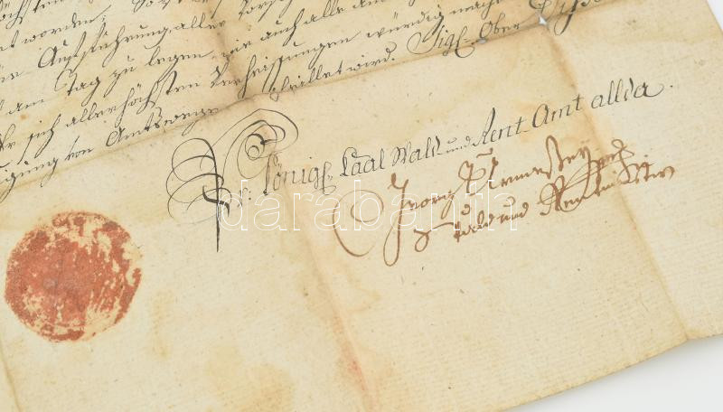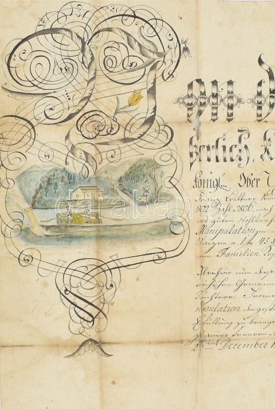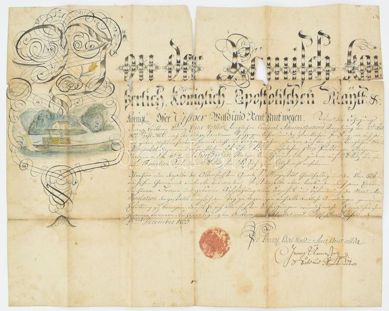 1803 FelsÅ‘visó (Viseu de Sus / Oberwischau), Erdély, a kir. erdészeti hivatal által kiállÃtott, német nyelvű oklevél / bizonyÃtvány, kézzel rajzolt, tutajosokat ábrázoló grafikával dÃszÃtve, sérülésekkel, kisebb hiánnyal, 48,5x39 cm
