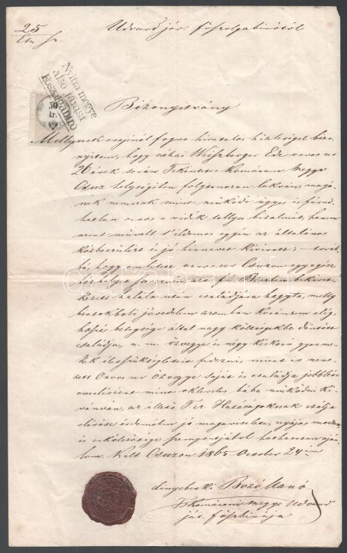 Leírás: 1865 Csúz település (Komárom megye, Szlovákia) viaszpecsétes igazolása orvos özvegye, bába részére