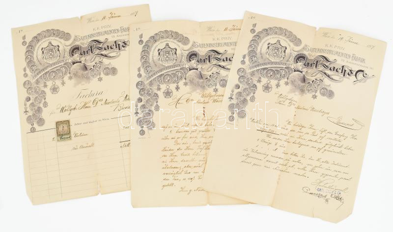 1897 Bécs (Wien), K. k. priv. Saiteninstrumenten-Fabrik Carl Zach & Co. neves bécsi hegedűkészítő fejléces üzleti levele és számlája (össz. 3 db), aláírásokkal, 5kr okmánybélyeggel, kisebb szakadásokkal