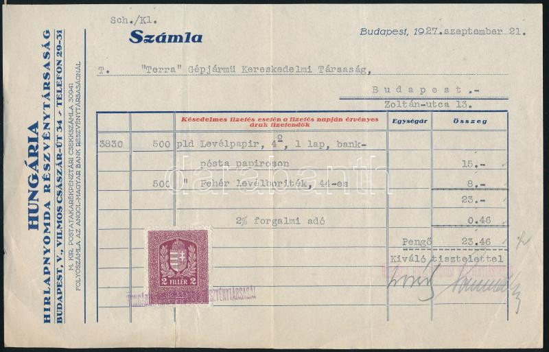 Leírás: 1927 Bp., Hungária Hírlapnyomda Részvénytársaság fejléces számla