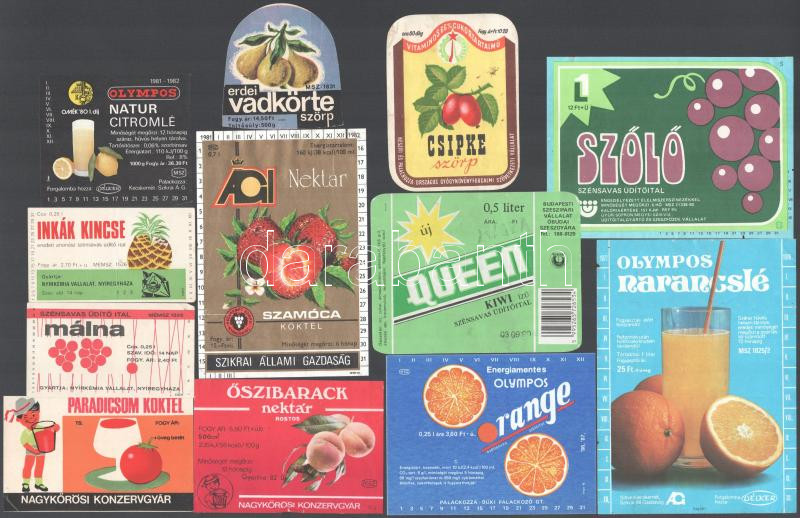 Leírás: 12 db magyar üdítőital címke a retró korszakból