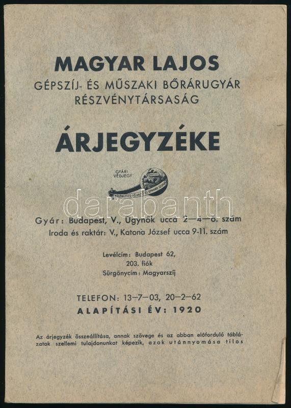 1934 Magyar Lajos Gépszíj- és Műszaki Bőrárugyár Rt. képes árjegyzéke, 95 p, kiadói papírkötésben, borítón ázásnyomokkal, néhány kevés lap kissé foltos