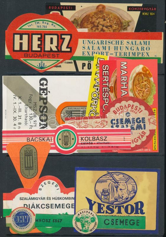 Leírás: A retró korszak magyar húsipari címkéi, 13 db