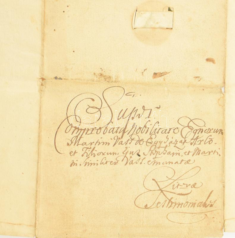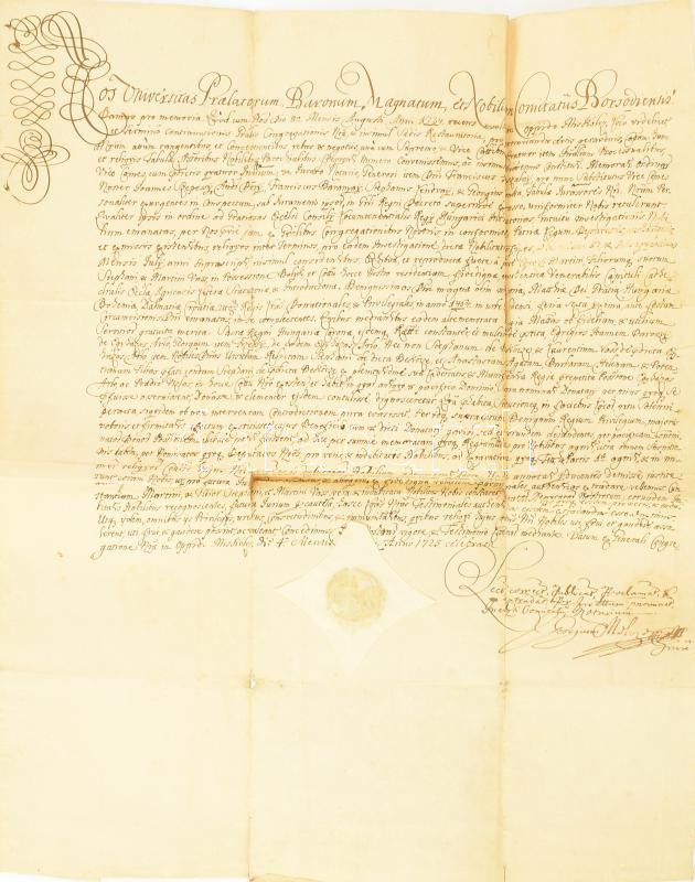 1725 egyházasarlói Vass Márton és leszármazói nemesi címének megerősítése és Borsod vármegye közönségének kihirdetése borsod vármegye főjegyzőjének aláírásával és a vármegye pecsétjével 41x51 cm
