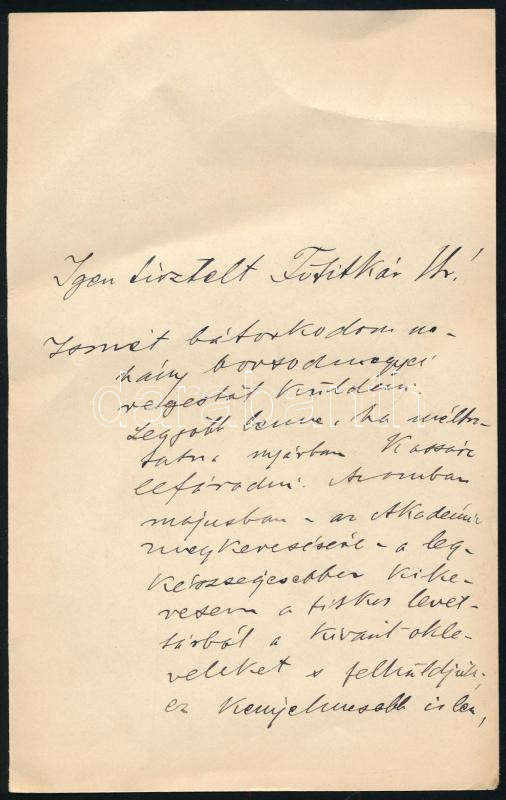 Leírás: 1911 Kemény Lajos (1859-1927) levéltáros kassai helytörténész autográf levele. Két beírt oldal