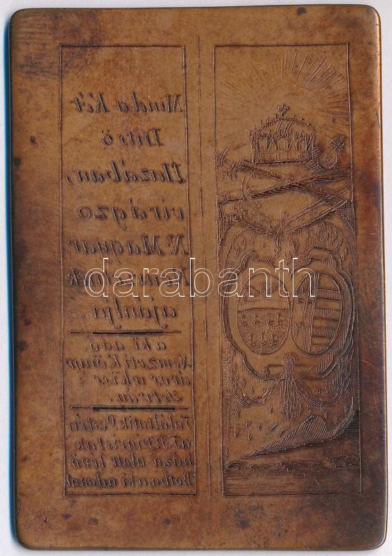 Magyar és erdélyi címerábrázolás, 1650-1700 körül kiadott magyar könyv táblájának újnyomására készült réz nyomólemezen. 53x77 mm Hozzá néhány merített papíros lenyomat