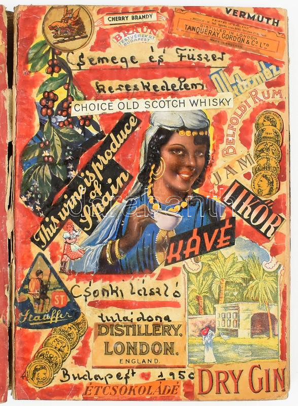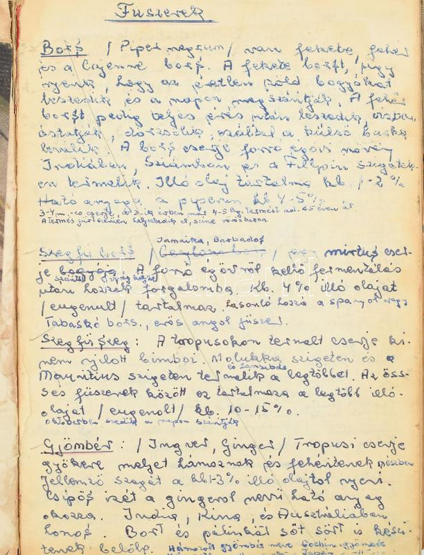 cca 1950 Kézzel írt könyv, főként háztartás, táplálkozás témájú bejegyzésekkel (fűszerek, növényi zsiradékok-olajok, tápanyagok, alkoholos italok, borászat, stb.), néhány lapon beragasztott képekkel, italcímkékkel, stb. Félbőr-kötésben, kissé viseltes, kopottas borítóval, helyenként hiányos lapokkal.