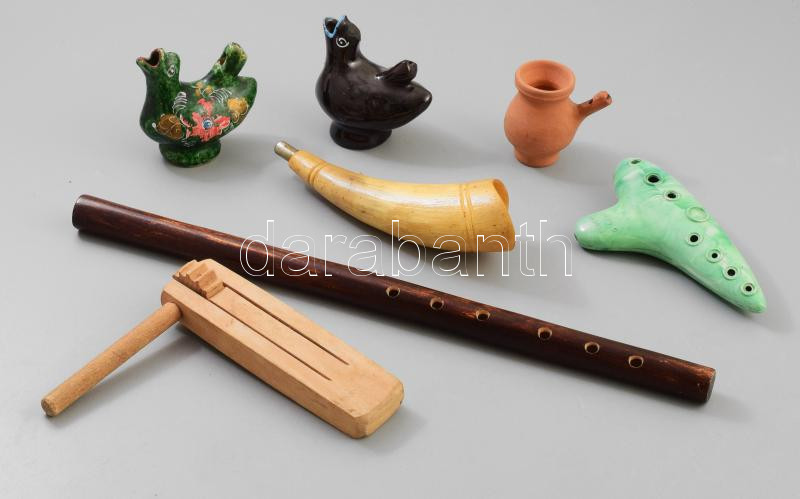 Leírás: 7 darab régi hangszer, közte okarina, síp