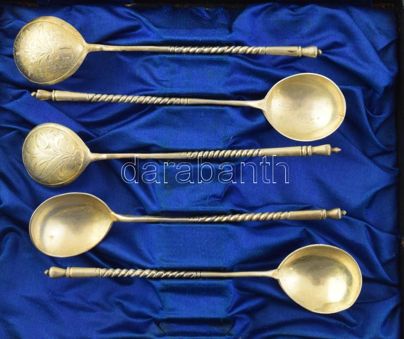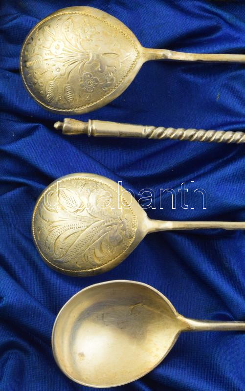 Leírás: 5 db kískanál, Orosz ezüst (Ag) 84 zolotniki finomságjellel. XIX. sz. jelzett 60 g díszdobozzal