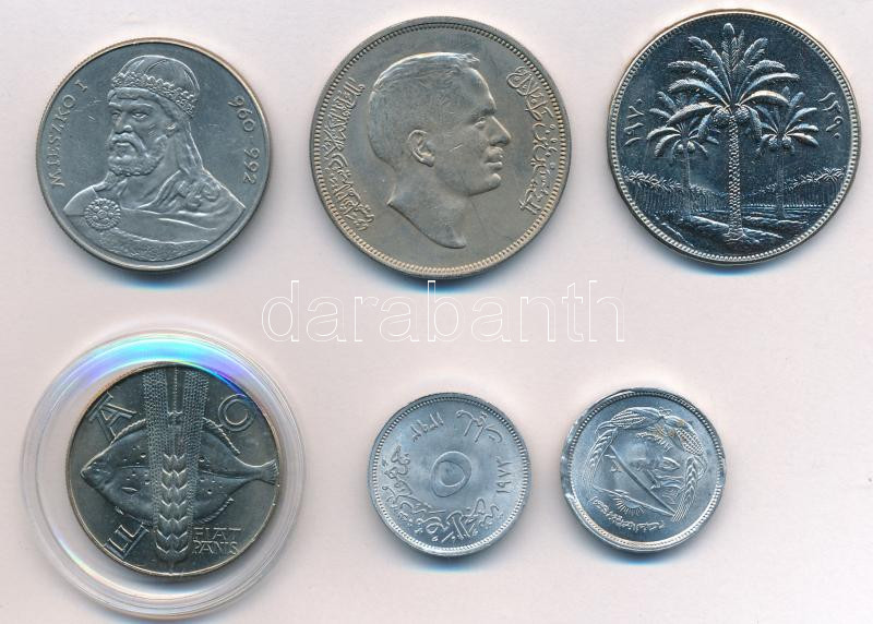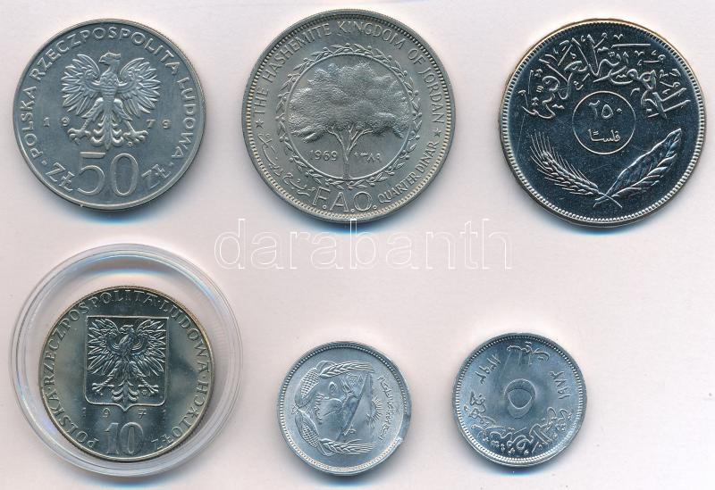 6pcs of foreign coin lot, in it Egypt 1973. 5 Milliemes Al "FAO - Completion of Aswan Dam" (2x) + Iraq 1970. 250 Fils Ni "FAO - 12th Anniversary of Land Reform" + Jordan 1969. 1/4 Dinar Cu-Ni "FAO / Hussein bin Talal" + Poland 1971. 10 Zlotych Cu-Ni "FAO" + 1979. 50 Zlotych Cu-Ni "Duke Mieszko I" C:UNC-XF with patina and scratch in it