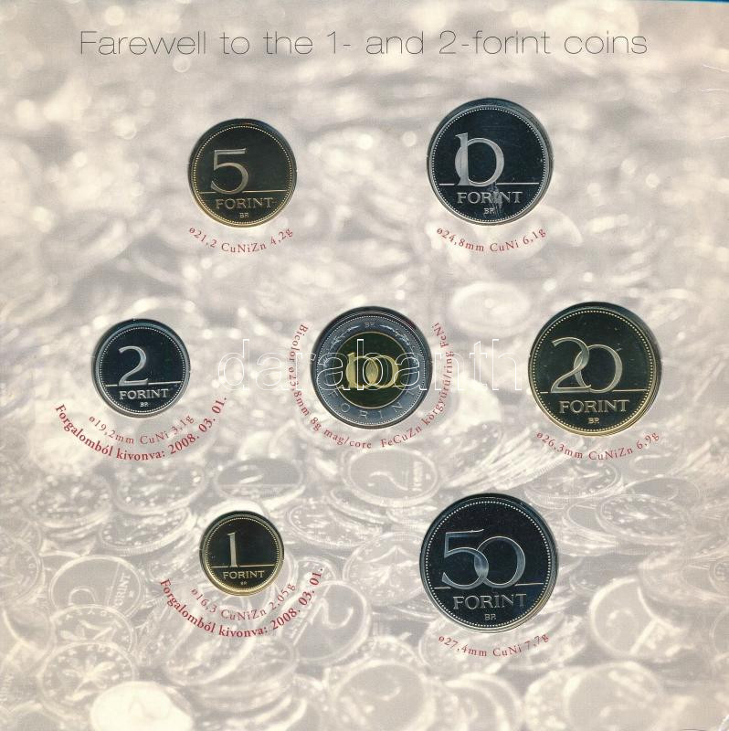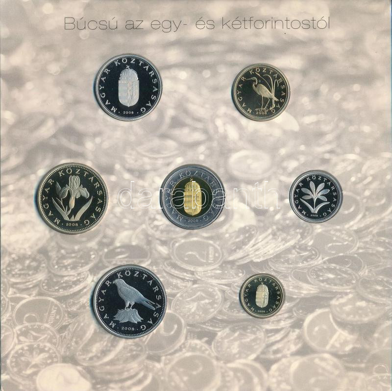 2008. 1Ft-100Ft (7xklf) "Búcsú az egy- és kétforintostól" forgalmi sor szettben. Belső tok ragasztása kissé elengedett, a külső tokon gyűrődések T:PP Adamo FO42.1