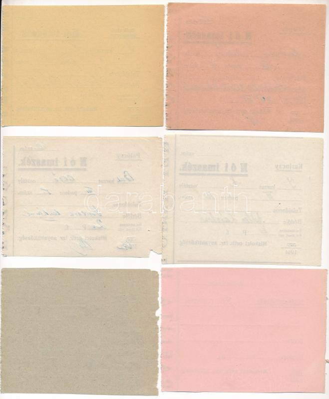 1920-~1962. "Miskolci orth. izr. anyahitközség" férfi imaszékre szóló bárcák a "Deák utcai tanácsterem", Díszterem", "Telegdy", "Telgedy-utcai fiókimaház", "Palóczy" és "Kazinczy" (6xklf) vegyesen kitöltve és kitöltetlenül, egy-egy darabon a dátum átjavítva későbbi időpontra és egy további darabon a pengő pénzem forintra átírva