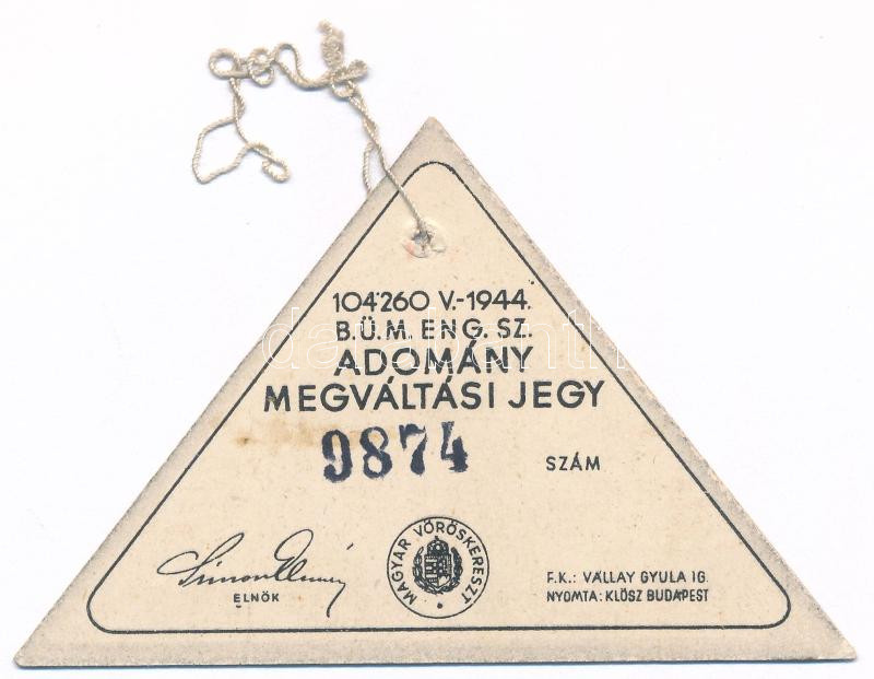 1944. "Vöröskeresztes Gyűjtőnapok 1944. X. 1-2." sorszámozot... https://www.darabanth.com/hu/473-Gyorsarveres/473.0/Numizmatika/Papir-es-fem-szuksegpenzek~1500007/1944-Voroskeresztes-Gyujtonapok-1944-X-1-2-sorszamozott-adomanyjegy-5P-rol-TAU~II3213057