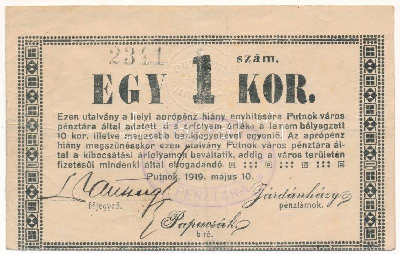 Leírás: Putnok 1919. 1K "Putnok M. Város Pénztára" bélyegzéssel T:F lyuk