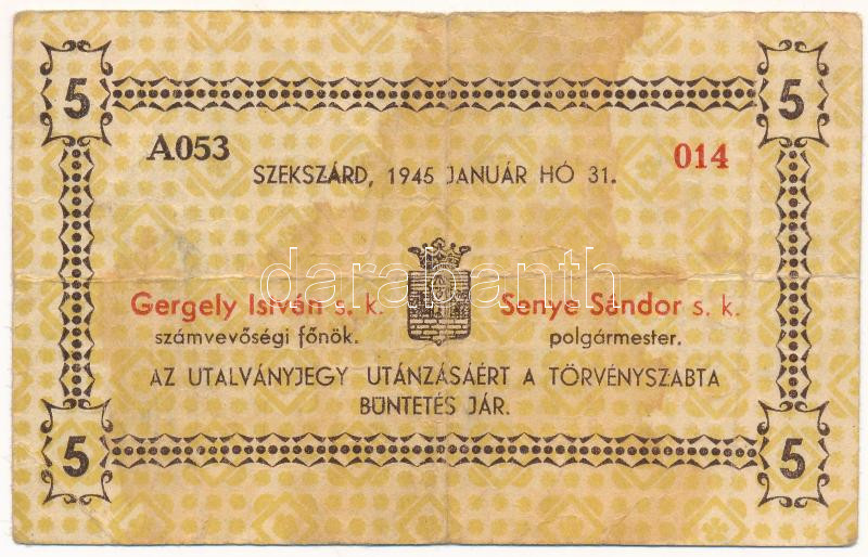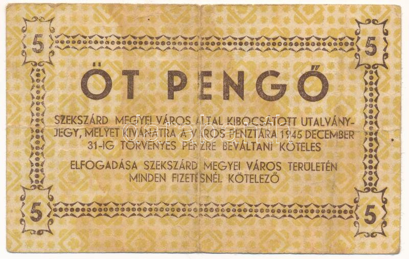 Leírás: Szekszárd 1945. "Szekszárd M. város" 5P utalvány T:F