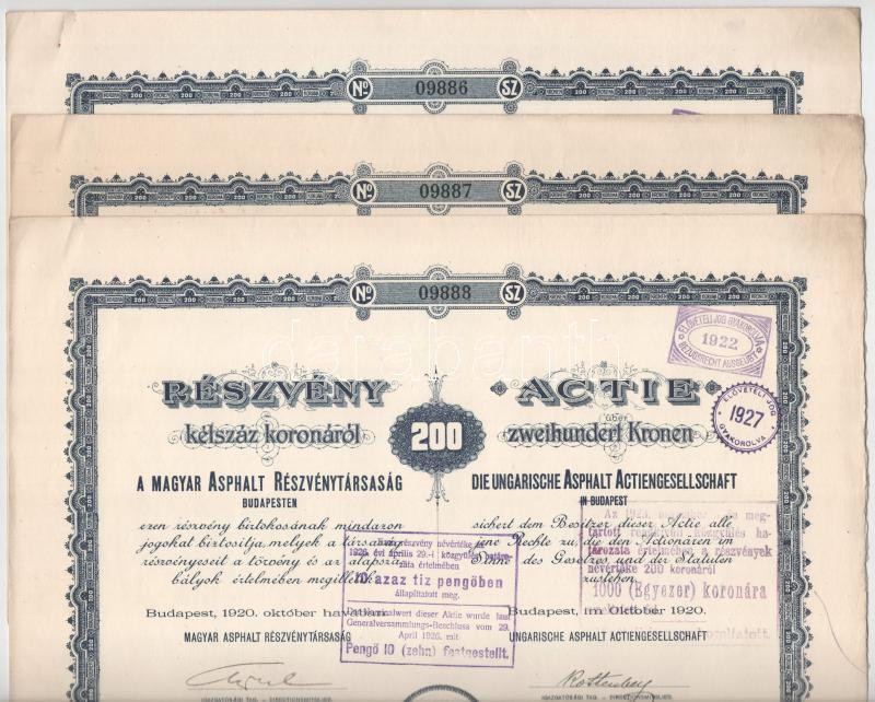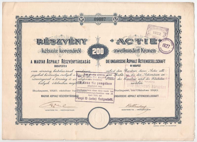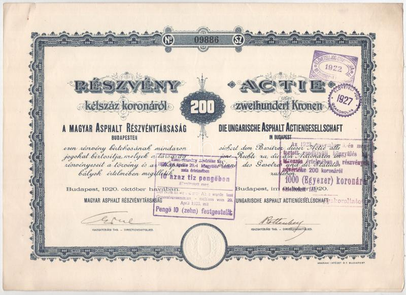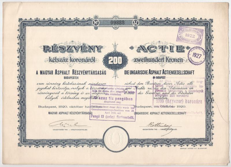 Budapest 1920. "Magyar Asphalt Részvénytársaság" részvénye 200K-ról, magyar és német nyelven, szelvények nélkül, szárazpecséttel, felülbélyegzésekkel (3x) sorszámkövetők T:XF folt