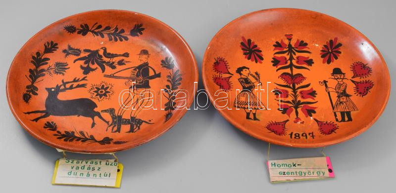 Leírás: 1993 Török Zoltán Budapest, 2 darab festett falitál, kopással, d: 24 cm
