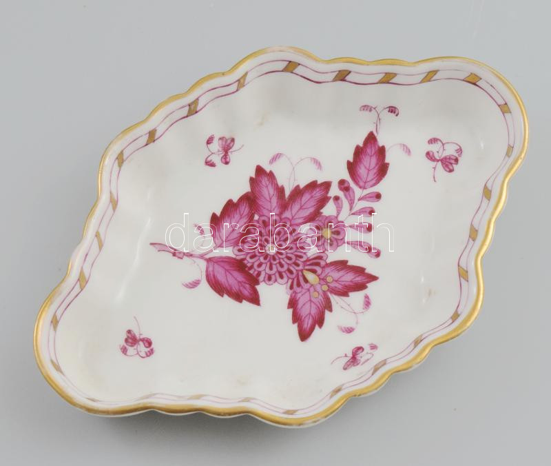 Leírás: Herendi Apponyi lila mintás ékszeres tálka. Jelzett, kis kopással, 12,5x8 cm