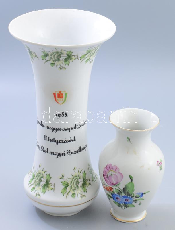 Leírás: Hollóházi nagyváza, 1988 KISZ lövészverseny feliratozással, kis pattogzással, m: + Herend 2. oszt. váza, jelzett, m: 18 cm