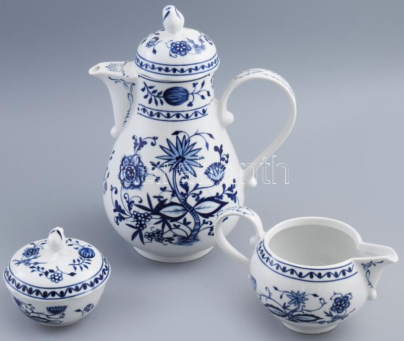 Leírás: Kahla hagymamintás teaszervírozó szett: kiöntő, tejkiöntő, cukortartó, jelzett, m: 24 cm alatt