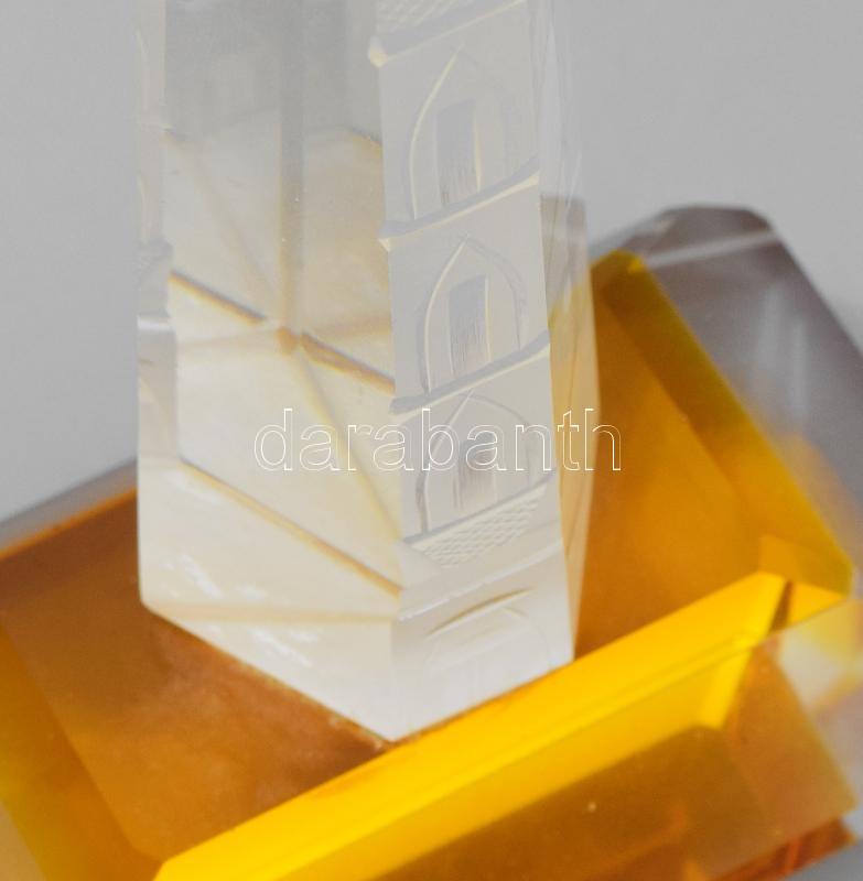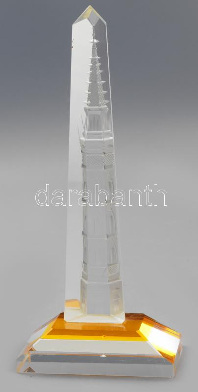 Leírás: Öntött kristály asztaldísz, oldalába köszörült épületmintával, jelzés nélkül, pattogzással, m: 22,5 cm