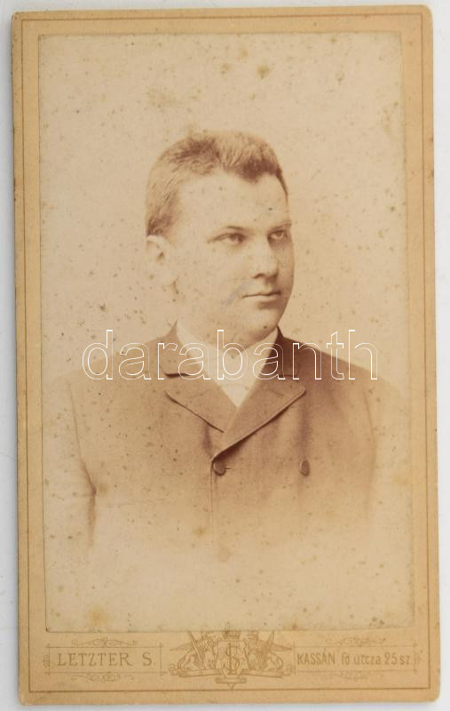 Leírás: cca 1890 Férfiportré, keményhátú fotó S Letzter kassai műterméből, a hátoldalán bejegyzéssel, a felületén foltokkal, 10x6 cm