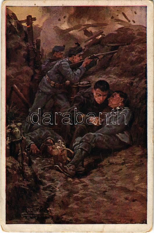 1918 Feldkurat Emil Boscarelli erteilt |ahrend des Kampfes der Landesschützen vom Trientner Regiment, selbts schon schwer verwundet, einem sterbenden Soldaten, nachdem er ihm Samariterdienste geleistet hatte, den letzten geistlichen Zuspruch. Aus dem goldenen Buche der Armee Serie V. Offizielle Karte für Rotes Kreuz, Kriegsfürsorgeamt, Kriegshilfsbüro Nr. 575. / WWI Austro-Hungarian K.u.K. military art postcard s: Fr. Jung (kopott sarkak / worn corners)