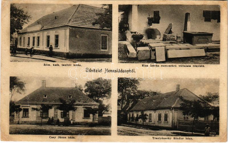 1920 Nemesládony (Vas), Római katolikus tanítói lakás, Kiss István cementáru vállalat részlete, Csay János és Trsztyánszky Sándor háza. Hangya szövetkezet kiadása, Steegmüller felvétele (r)